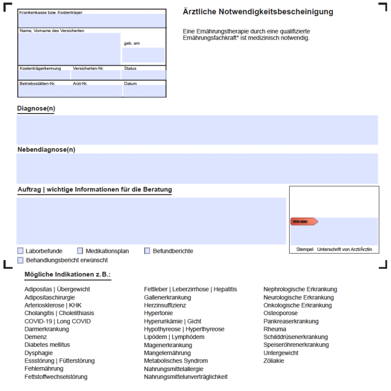Diese Bescheinigung benötigen Sie, wenn Sie eine Ernährungstherapie von Ihrer Krankenkasse bezuschussen lassen möchten.